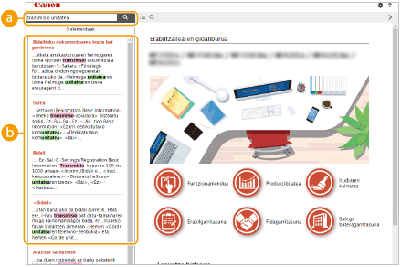 bilaketa-pantaila bistaratzeko. Gakoen bidezko bilaketak burutzeko testu-lauki bat dauka, bilatzen ari zaren orrialdea aurkitzeko.