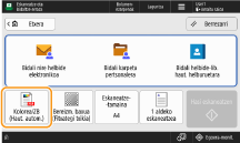Eskaneatze eta bidaltze erraza pantailak botoiak eskaintzeko ditu oinarrizko ezarpenak erraz konfiguratzeko, hala nola helmuga eta kolore modua.