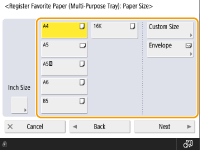 If <Always Specify> under <Multi-Purpose Tray Defaults> is set to <Favorite Paper>, a screen is displayed to allow you to select your "Favorite Paper" when you load the paper in the multi-purpose tray. <Multi-Purpose Tray Defaults> |