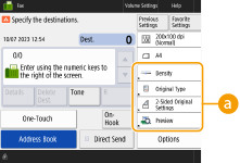 The number of setting items located on the Basic Features screen and the location to be displayed differ depending on functions. A shortcut button is not displayed if <Unassigned> is set as a shortcut. The limit to the number of shortcuts for <Options> you can register is as follows. Copy: 5 Fax: 4 Scan and Send: 2 |