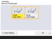 Depending on the paper type, you cannot use finishing functions. Hardware Specifications When placing an original on the platen glassPressing <Options> <Job Build> on the Copy Basic Features screen enables you to use the Collate/Group function even if the original is placed on the platen glass.Insert a job separator between each page during a group outputIf you select <Group (Same Pages)>, you can insert a job separator between each group. For more information, see <Job Separator Between Groups>. <Job Separator Between Groups> When configuring settings in <Access Stored Files>You can use finishing functions only when printing PDF/XPS files. |