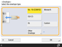 2 | Select the type of envelopes. ![]() To register a custom size envelope, press <Custom> <Next> and press <X> or <Y> to specify the side, then use the numeric keys to enter the length of the specified side. |