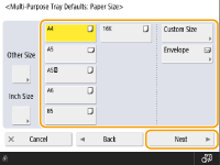 2 | Select the paper size. ![]() ![]() For information on the paper sizes displayed when <Other Size> is pressed, see Available Paper. |
