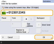 To send faxes overseasEnter the international access number, the country code, and the fax number, in that order. If you cannot successfully connect to the destination overseas, press <Pause> to insert a pause between a number and the next number. To send faxes with a subaddressThe machine supports the use of ITU-T* standard subaddresses. If the recipient's fax machine is compatible with the use of ITU-T subaddresses, you can enhance the confidentiality of sent documents using a subaddress and password. To send a document with a subaddress, enter a fax number, press <Subaddress>, and then enter the subaddress and password. * Stands for International Telecommunication Union-Telecommunication Standardization Sector, which is the group that makes recommendations towards the standardization of worldwide telecommunications. |