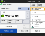 To check the total number of specified destinationsThe total number of specified destinations is displayed on the top right of the screen. This enables you to confirm that the number of destinations is correct before sending. ![]() To send with the sender informationYou can send with the sender's name and fax number. <TX Terminal ID> To check the statuses for sent documentsOn the <Status Monitor> screen, you can check the statuses for sent documents. This screen enables you to send faxes again or cancel sending after checking the statuses. Checking Status and Log for Sent and Received Documents When <Display Notification When Job Is Accepted> is set to <On>, the <Status Monitor> screen can be displayed from the following screen that is shown after a send job is received. <Display Notification When Job Is Accepted> ![]() When a transmission error occurs because the recipient's line is busyThe machine automatically redials after a certain period of time. You can change the settings such as how many times the machine redials and the interval between redials. <Auto Redial> To print the report for the results of sendingOn the Fax Basic Features screen, pressing <Options> <TX Result Report> enables you to set to automatically print the report listing the results of sending.To set this for each job from <Options>, it is necessary to select <For Error Only> or <Off> in <TX Result Report>, and then set <Allow Printing from Options> to <On>. When photos in the sent image are too dark or light colors in the background of color originals cannot be removedThe quality of the sent image may be able to be improved if the following conditions/settings are met. Job type: Fax (Memory Sending) or Scan and Send (Fax/I-fax) <Select Color>: <Black & White> (Scan and Send) <Original Type>: <Text> <Density> <Background Density>: <Auto><Resolution>: 200 dpi x 400 dpi, 300 dpi x 300 dpi*, 400 dpi x 400 dpi, or 600 dpi x 600 dpi* *Can be set for Scan and Send <Speed/Image Quality Priority for Black & White Scan> Fax/I-Fax Send Jobs: <Quality Priority> (<Speed/Image Quality Priority for Black & White Scan>) |