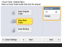 1 | Press <Erase Book Frame> and check <Original Size>. ![]() If the size displayed in <Original Size> is different from the size of the book, press <Change> to select the size. You can only set the Erase Book Frame mode for the original sizes shown on the touch panel display. |