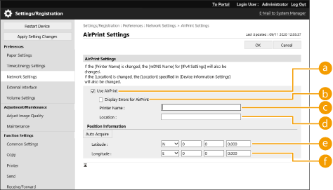 You can register information, including the name of the machine and installation location, that is used for identifying the machine. The settings required for using AirPrint can be configured remotely using the Remote UI.