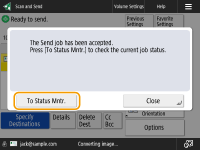 To check the total number of specified destinationsThe total number of specified destinations is displayed on the top right of the screen. This enables you to confirm that the number of destinations is correct before sending. To immediately cancel a job that is being sentIf you press  (Stop) on the control panel while a job is being sent, the message <Is it OK to cancel the following Send job?> appears. Press <Yes> to cancel sending. Press  (Stop) when there are multiple send jobs to display the screen for selecting the send job to cancel. If the send job you want to cancel is not displayed, press <Check Other Jobs> to display <Send Jobs>. Select the job that you want to cancel, and press <Cancel>. To check the statuses for sent/saved documentsOn the <Status Monitor> screen, you can check the statuses for sent/saved documents. This screen enables you to send/save documents again or cancel sending/saving after checking the statuses. Checking Status and Log for Scanned DocumentsWhen <Display Notification When Job Is Accepted> is set to <On>, the <Status Monitor> screen can be displayed from the following screen that is shown after a send job is received. <Display Notification When Job Is Accepted>To print the report for the results of sending/savingOn the Scan Basic Features screen, pressing <Options>  <TX Result Report> enables you to set to automatically print the report listing the results of sending/saving. To set this for each job from <Options>, it is necessary to select <For Error Only> or <Off> in <TX Result Report>, and then set <Allow Printing from Options> to <On>. File nameWhen a file is sent/saved, its file name is automatically set based on the following format. You can change the setting so that a different name can be assigned. Setting a File NameWhen sending by e-mail "Job numbers (four digits)_page numbers (three digits).file extension name" format, such as "1042_001.jpg" When saving in a file server "The year, month, day, hour, minute, and second the file is saved (14 digits).file extension name" format, such as "20151030133541.jpg" E-mail subject |