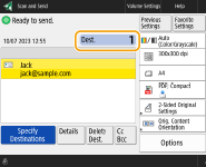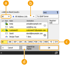 You can press <Register to Address Book> to register the entered destination. Set the required conditions, specify <Name>, and specify the address list from the address list drop-down list. For information on the settings, see