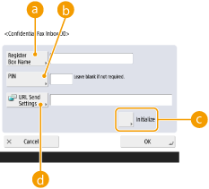 5 | Select the box number specify each setting, and press <OK>.![]() <Register Box Name>Register a name for the box. <PIN>Enter the PIN for the box. <Initialize>Initializes the box. <URL Send Settings>Enables the URL for a box with documents saved can be sent via e-mail or checked on the Remote UI screen.