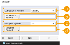 7 | Enter the necessary information. ![]() <Authentication Algorithm>Select MD5, SHA1, or SHA2 according to your environment. For SHA2, select from four hash lengths (224 bit, 256 bit, 384 bit, or 512 bit). <Authentication Password>Enter a password to use for authentication. When the password is entered, <Confirm> is displayed for confirmation. Enter the password again. <Encryption Algorithm>Select <DES> or <AES> according to your environment. <Encryption Password>Enter a password to use for encoding. When the password is entered, <Confirm> is displayed for confirmation. Enter the password again. |