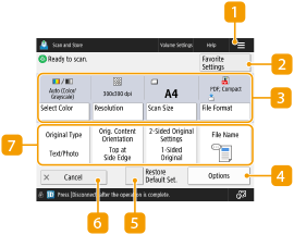 When you press <Scan and Store> on the <Home> screen, and then press <Network> or <Memory Media> to scan originals, the following setting screen is displayed.