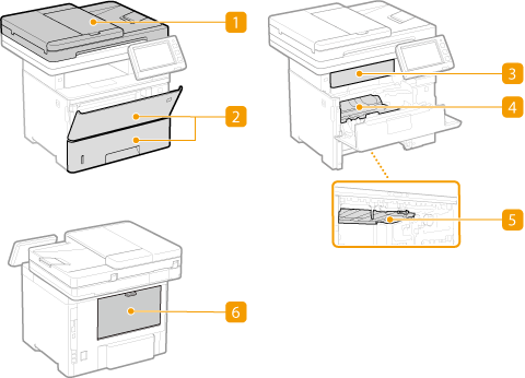 Paper may not actually be jammed in the location you check. Even in this case, follow the instructions on the screen to check all the locations. The screen indicating that there is a paper jam is repeatedly displayed until you clear the paper jam. If you press <Close> on the screen indicating that there is a paper jam, you may be able to continue to perform operations and specify settings without immediately removing the paper jam. Do not remove paper from a location other than that displayed as a paper jam location on the screen. This may cause paper jams in other locations or missing pages in output documents. |