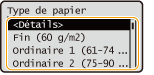 Pour vérifier les réglages détaillés d'un type de papier, sélectionnez <Détails>