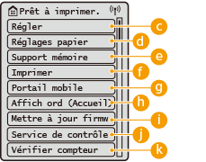 <Réglages de fonction>, <Préférences> et de nombreux autres réglages de l'appareil sont accessibles depuis ce bouton.
