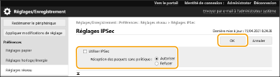 Vous pouvez également activer ou désactiver la communication IPSec de <Régler> dans l'écran <Accueil>. <Réglages IPSec>