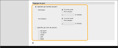Sélectionnez [Spécifier par numéro de port] pour utiliser des numéros de port lors de la spécification des ports auxquels appliquer IPSec. Sélectionnez [Tous les ports] pour appliquer IPSec à tous les numéros de port. Pour appliquer IPSec à un numéro de port spécifique, appuyez sur [Port unique] et saisissez le numéro de port. Spécifiez le port de cette machine dans [Port local] et spécifiez le port de l'homologue de communication dans [Port distant].