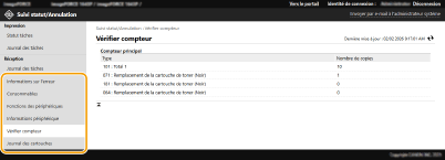 Vous pouvez vérifier diverses informations sur la machine, comme des informations d'erreur, la quantité restante de papier et d'encre, des informations sur l'équipement optionnel relié et le nombre total de pages qui ont été imprimées jusqu'à maintenant.