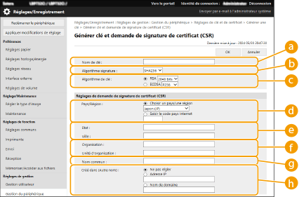 Vous pouvez générer une clé et CSR sur l'appareil. Vous pouvez aussi afficher les données CSR à l'écran et les exporter en tant que fichier.
