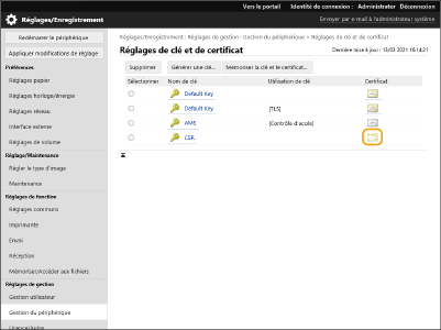 Cliquez sur [Gestion du périphérique]  [Réglages de clé et de certificat].