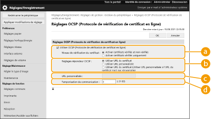 Il y a deux méthodes pour vérifier si les certificats reçus lors d'une communication avec un tiers sont valides : par comparaison avec la liste de révocation de certificat (CRL) enregistrée sur l'appareil et par interrogation d'un répondeur OCSP (online certificate status protocol) (pour un serveur prenant en charge OCSP). Définissez la méthode de vérification de la validité des certificats en fonction de votre environnement. Seul l'administrateur peut effectuer cet enregistrement.