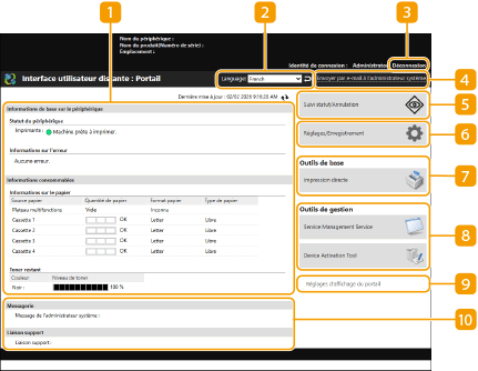 Certains éléments et fonctions de l'affichage ne sont disponibles que si vous vous connectez avec des privilèges Administrateur. Si plusieurs utilisateurs utilisent l'interface utilisateur distante en même temps ou si le panneau de commande de l'appareil est utilisé en même temps que l'interface utilisateur distante, la dernière opération exécutée est appliquée. |