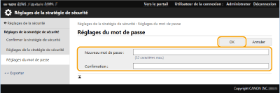 Saisissez le mot de passe actuel dans [Mot de passe actuel :], et cliquez sur [OK] sans saisir aucune valeur pour [Nouveau mot de passe :] ou [Confirmation :] (laissez les champs vides). Si vous avez configuré une limite pour le nombre de caractères pouvant être saisis dans [Stratégie de réglages du mot de passe], vous devez alors saisir une valeur pour cette option. Annulez la limite avant de supprimer le mot de passe. Options pour les réglages relatifs à la politique de sécurité