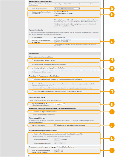 Vous pouvez configurer les modes de connexion de l'utilisateur, les dispositifs d'authentification et d’autres fonctions d'authentification selon votre environnement système et vos besoins.