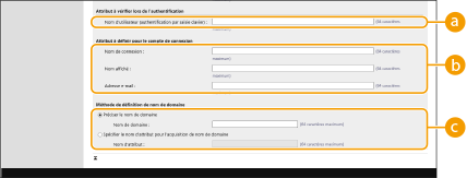 4 | Spécifiez comment définir les noms d'attributs et le nom de domaine. ![]() [Nom d'utilisateur (authentification par saisie clavier) :]Spécifiez le champ de données LDAP (nom d'attribut) pour le nom d'utilisateur sur le serveur LDAP (Exemple : uid). [Nom de connexion :] / [Nom affiché :] / [Adresse e-mail :]Spécifiez les champs de données LDAP (noms d'attribut) pour le nom de connexion, le nom d'affichage et l'adresse e-mail de chaque compte d'utilisateur sur le serveur LDAP (Exemple : uid, cn, mail). [Préciser le nom de domaine] / [Spécifier le nom d'attribut pour l'acquisition de nom de domaine]Sélectionnez comment définir le nom de domaine de la destination de connexion. Pour spécifier le nom de domaine directement, sélectionnez [Préciser le nom de domaine] et saisissez le nom de domaine. Pour spécifier un champ de données LDAP (nom d'attribut) à partir duquel acquérir le nom de domaine sur le serveur LDAP, sélectionnez [Spécifier le nom d'attribut pour l'acquisition de nom de domaine] et saisissez le nom d'attribut (Exemple : dc). |