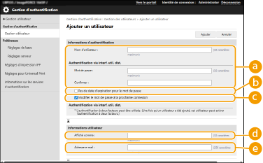 Cochez la case pour que le mot de passe de l'utilisateur à enregistrer n'ait pas de date d'expiration. Vous pouvez faire ce réglage si [Définir la durée de validité du mot de passe] est réglé sur [Non] dans [Stratégie de réglages du mot de passe] dans [Authentification] dans [Réglages de la stratégie de sécurité].