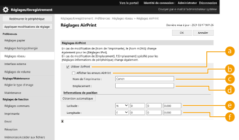 Si vous vous connectez en tant qu'administrateur, vous pouvez également modifier les réglages d'AirPrint depuis la page d'AirPrint.
