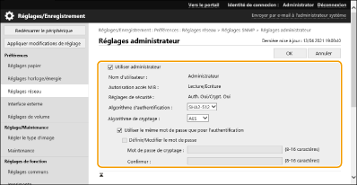 Vous pouvez activer ou désactiver les réglages SNMP dans <Régler>. <Réglages SNMP>