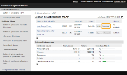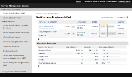 Si hace clic en el botón [Iniciar] / [Detener], situado a la derecha del estado de funcionamiento, puede iniciar/detener el uso de la aplicación MEAP.