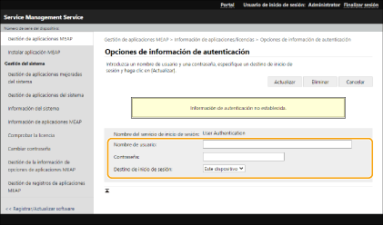 [Gestión del sistema]: Aparece una página para administrar aplicaciones e información relacionada con el sistema MEAP.