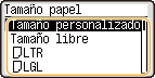 Si necesita cambiar frecuentemente el papel que se va a cargar, ajuste en <Tamaño libre>; esto reducirá el número de pasos necesarios para cambiar el ajuste. También puede visualizar un mensaje de error cuando la configuración del controlador de la impresora sea significativamente diferente al tamaño del papel cargado. <Dif. tam. pap. para origen pap. tam. lib>