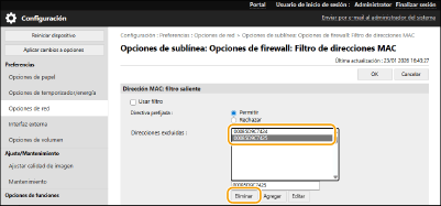 Si se introduce incorrectamente la dirección MAC, es posible que no pueda acceder al equipo desde la IU remota. En cuyo caso deberá ajustar <Usar filtro> en <No> para <Filtro saliente>/<Filtro entrante> en <Filtro de direcciones MAC> desde el panel de control.