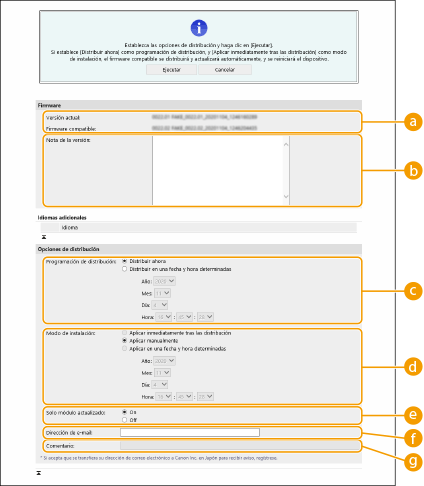 [Programación de distribución]Para descargar el firmware de inmediato, seleccione [Distribuir ahora]. Para descargar el firmware automáticamente en una fecha y hora especificadas, seleccione [Distribuir en una fecha y hora determinadas] y especifique la fecha y la hora en [Año:]/[Mes:]/[Día:]/[Hora:]. Puede programar una hora con una semana de antelación.