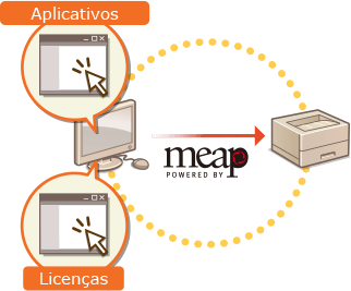 MEAP (plataforma do aplicativo multifuncional embutido) é um framework para aprimorar e otimizar diversas funções instaladas na máquina, como "Autenticação" e "Saída". Por exemplo, a gestão de usuários usando cartões IC e a colaboração com software que agiliza o processamento de arquivos tornam-se possíveis através do MEAP. Para aprimorar as funções conforme mencionado anteriormente, é necessário instalar um aplicativo dedicado denominado chamado "aplicativo MEAP" na máquina. Você pode instalar aplicativos MEAP e verificar seu estado de uso exibindo o SMS (serviço de gestão do serviço) a partir da UI remota. Não é necessário fazer login de administrador para instalar um aplicativo MEAP (