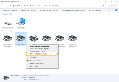 Clique com o botão direito no ícone da impressora da sua máquina e clique em [Propriedades da impressora].