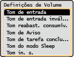 <Tom do modo Sleep> | Som produzido quando a máquina entra em modo de espera ou quando a máquina é DESLIGADA se você configura <Defs. Arranque Rápido p/Aliment. Princ.> como <Ligado>. (Dependendo das situações, a máquina não iniciará rapidamente e o som não será produzido.) |