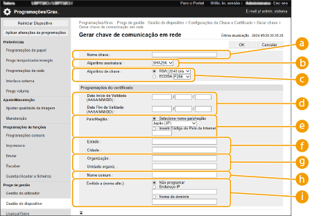 [Algoritmo de chave]Selecione [RSA] ou [ECDSA] como algoritmo de geração de chaves. Selecione o comprimento da chave se você selecionou [RSA] e o tipo de chave se selecionou [ECDSA]. Em ambos os casos, um valor mais alto fornece maior segurança, mas reduz a velocidade de processamento da comunicação.