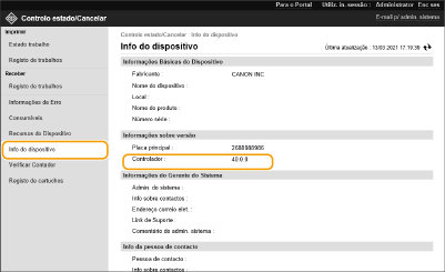 Preparando para atualização de firmwareFaça download do firmware mais recente no site da Canon (https://global.canon/). Faça backup dos dados e configurações da máquina para o caso da atualização de firmware não ser realizada apropriadamente. Nota relacionada ao processo de atualizaçãoA máquina reinicia várias vezes. O processo de atualização é interrompido se restam trabalhos. A tela troca várias vezes durante o processo de atualização. Pode levar um tempo para a tela trocar, mas não feche o navegador até que o processo esteja concluído. |