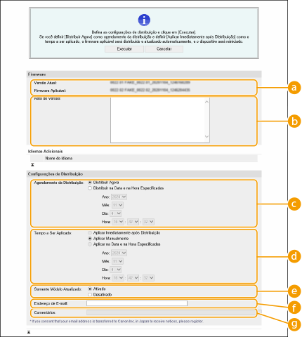 [Agendamento da Distribuição]Para baixar o firmware imediatamente, selecione [Distribuir Agora]. Para baixar o firmware automaticamente em uma data e hora especificadas, selecione [Distribuir na Data e na Hora Especificadas] e especifique a data e a hora [Ano:]/[Mês:]/[Dia:]/[Hora:]. Você pode programar uma hora dentro de uma semana com antecedência.
