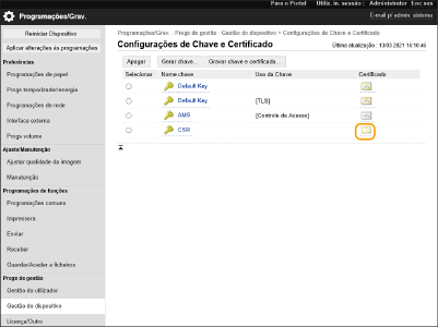 Os certificados gerados nesta máquina não possuem uma assinatura CA, o que pode causar erros de comunicação com alguns pontos de comunicação. Para solicitar um certificado com uma assinatura CA, uma solicitação de assinatura de certificado (CSR) de dados é necessária. Uma CSR poderá ser gerada por um usuário que fizer login com privilégios de administrador.