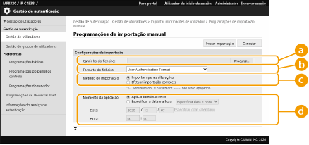 Se selecionar [Efetuar importação completa] e um usuário com o mesmo nome de usuário já estiver registrado, as informações do usuário serão sobrescritas.
