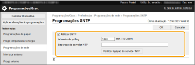 O Protocolo de tempo de rede simples (SNTP) permite ajustar o relógio do sistema usando o servidor de hora na rede. Se SNTP for usado, o servidor de hora será verificado nos intervalos especificados; portanto, a hora correta pode sempre ser mantida. As configurações de SNTP podem ser especificadas via IU Remota.