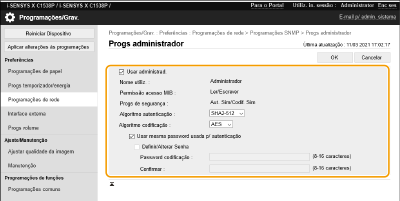 1 | Clique em [Progs administrador]. [Usar administrad.] Marque a caixa de seleção para usar o usuário Administrador. [Algoritmo autenticação] e [Algoritmo codificação] não podem ser alterados. [Usar mesma password usada p/autenticação] Marque a caixa de seleção para usar a mesma senha que foi usada na autenticação do usuário. |