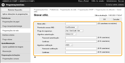 3 | Clique em [Progs utilizador]  [Gravar]. [Nome utiliz.] Insira caracteres alfanuméricos para o nome de usuário. [Permissão acesso MIB] Selecione [Ler/Escrever] ou [Só leitura] para os privilégios de acesso aos objetos MIB. [Ler/Escrever] | Permite exibir e alterar os valores dos objetos MIB. | [Só leitura] | Permite ver apenas os valores dos objetos MIB. |