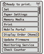 Select <Display Order (Home)> to customize the <Home> screen by rearranging the buttons. Customizing the Display