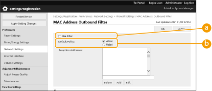 Select the precondition (default policy) to allow or reject the communication of other devices with the machine, and then specify MAC addresses for exceptions.